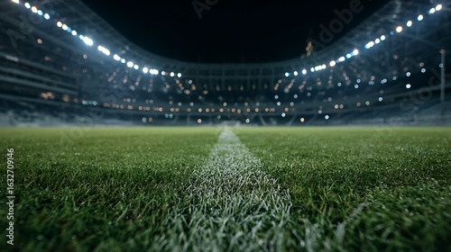 Green stadium grass field illuminated by bright stadium lights at night image