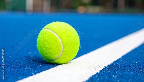 Green tennis balls lie on a blue court, with one isolated on the net, ready for a competitive sport