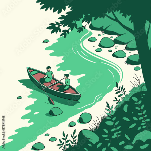 Green tinted river with canoe holding two people green river