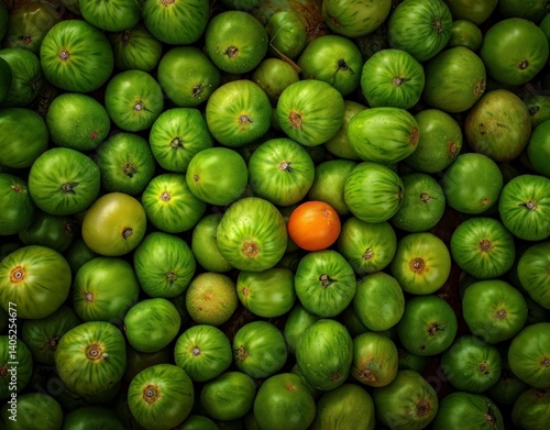 Green Tomatoes Pattern with Single Orange Tomato Contrasting Fresh Produce