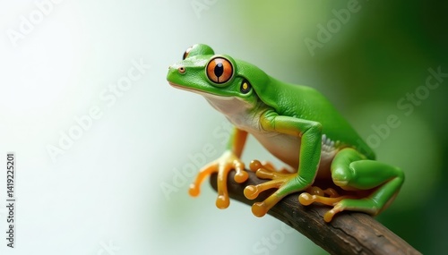 Green tree frog perched on white, vibrant skin, exotic, white background