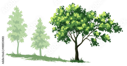 Green Trees Illustration, Nature Painting, Lush Foliage, Spring Scenery