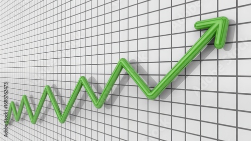 Green upward trending arrow graph showing financial growth and positive economic progress on a grid background