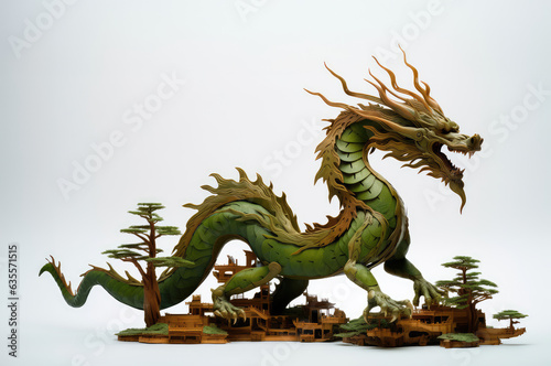 Green wooden dragon. Symbol of the new 2024 year. Mythical creature from fantasy stories. White back.