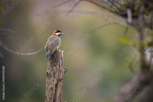 Green-barred woodpecker perched on a log