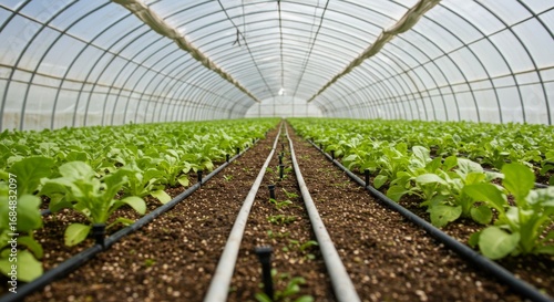 Greenhouse Drip Irrigation System Watering Rows of Lettuce Plants for Efficient Farming