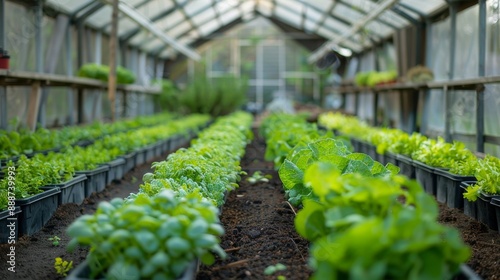 Greenhouse interior with neatly organized rows of vegetable plants Generative AI