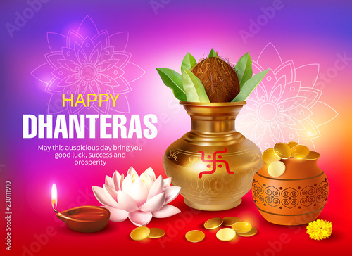 Greeting background with kalash, diya and gold coins for Indian festival Dhanteras (Diwali season). Vector illustration.