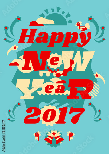 Greeting card happy new year. Typographical printing. Year of the rooster. Sunrise, clouds, stars. Animals and letters. Bells, ribbon. Label, isolated objects on background. Vector illustration