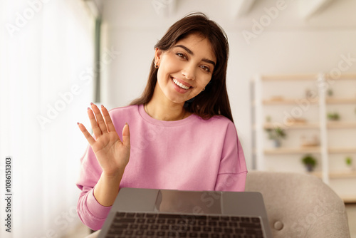 Greeting Concept. Portrait of smiling beautiful woman waving hello with hand looking at camera, using laptop at home office. Cheerful lady saying hi or goodbye during video call, blurred background