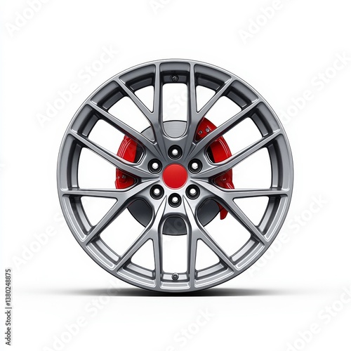 Grey Alloy Wheel with Red Brake Caliper on White Background
