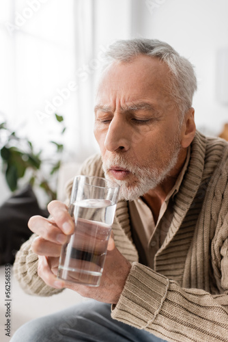 grey haired man with parkinsonism holding glass of water in trembling hands at home.