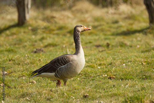 Greylag goose standing in the meadow on a sunny day, greylag goose in the sunshine, goose in the meadow, rural scene with a bird looking to the right, Anser anser
