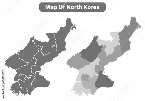 Greyscale North Korea political map with borders outline style vector illustration set