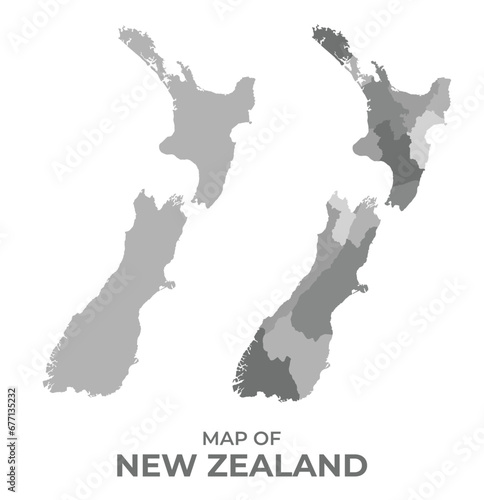 Greyscale vector map of new zealand with regions and simple flat illustration