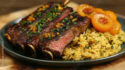 Grilled Beef Short Ribs with Plums and Saffron Rice