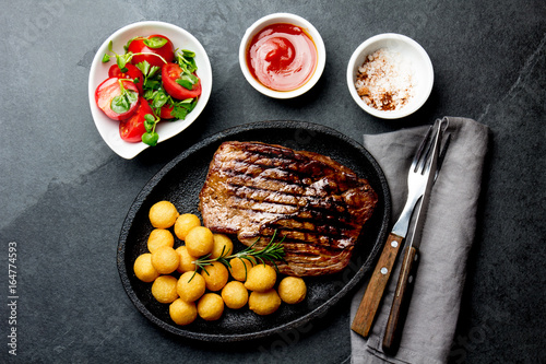 Grilled beef steak served on cast iron plate with tomato salad and potatoes balls. Barbecue, bbq meat beef tenderloin. Top view, slate background