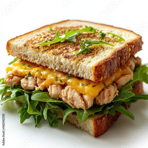 Grilled Chicken and Cheese Sandwich with Arugula on White Background