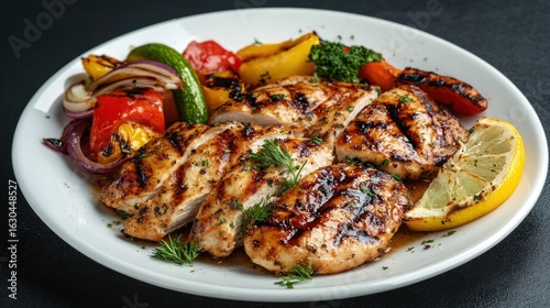 Grilled chicken breast slices with grilled vegetables and lemon on a white plate.
