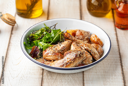 Grilled chicken wings served with fresh mixed greens and roasted potatoes on a rustic white plate