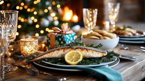 Grilled fish fillet with lemon slice on festive table decorated with candles and Christmas lights.