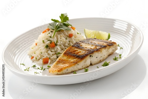 Grilled Fish with Rice on White Plate – High-Resolution Isolated Food Photo