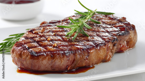 Grilled Ribeye Steak with Herbs and Marinade on a White Plate, High Resolution for Culinary Use