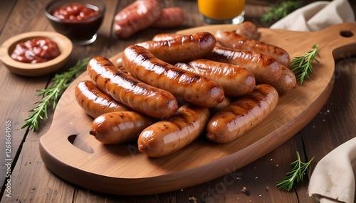 Grilled sausages on a wooden cutting board