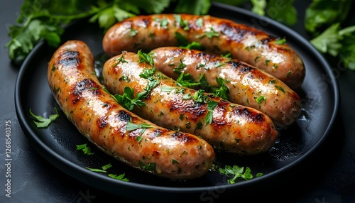 Grilled sausages with butter and fresh herbs on a dark plate, a food photo for a menu