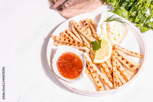 Grilled scorzonera with sauces set with modern hard light, dark shadow