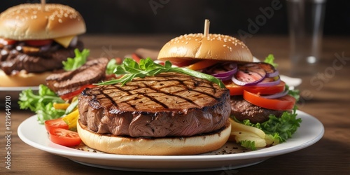 Grilled steak on a plate with a savory burger as the main course , kitchen, gourmet