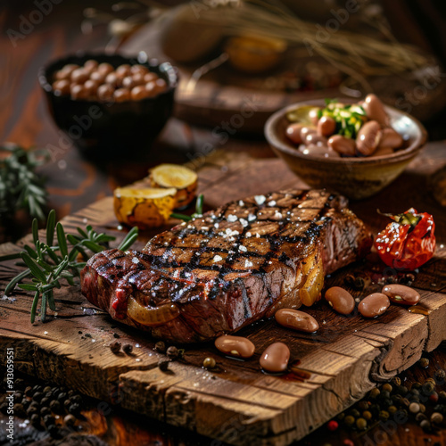 Grilled Steak with Beans and Rosemary on a Wooden Cutting Board
