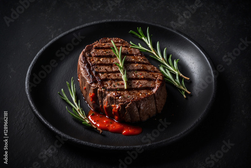 Grilled steak with rosemary, black plate, dark stone backdrop, red sauce accent, natural side shadows