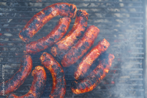 Grilling sausages on barbecue grill. Delicious sausages on charcoal grill