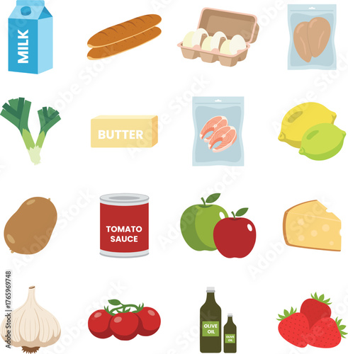 Grocery food items collection with dairy vegetables and fruits