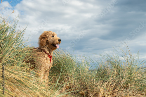 Groodle dog standing in coastal grass dunes under cloudy sky