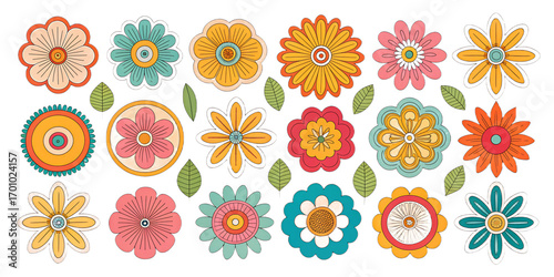 Groovy Flower Power Stickers PNG Set – Retro 70s Colorful Flowers, Flat Illustration, Transparent Background