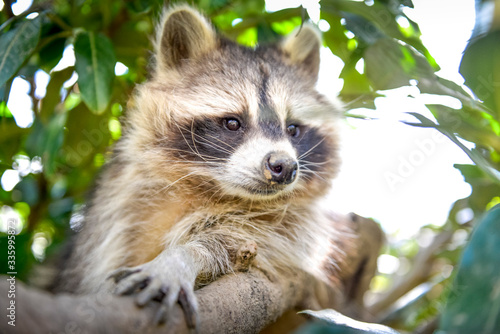 gros plan d'un mignon raton laveur à l'extérieure monter sur arbre