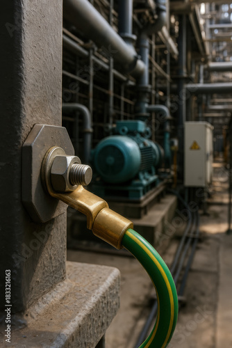 Ground wire connection industrial power plant safety grounding and protection showing bolted terminal with green-yellow cable near pump motor and control in a utility plant