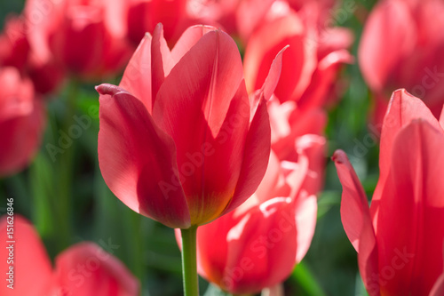 Group and close up of red lily-flowered singlebeautiful tulips growing in the garden