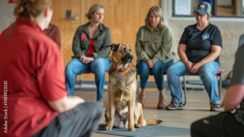 Group Dog Training Session with Attentive Mixed Breed Dog and People in Casual Clothing in Indoor Setting