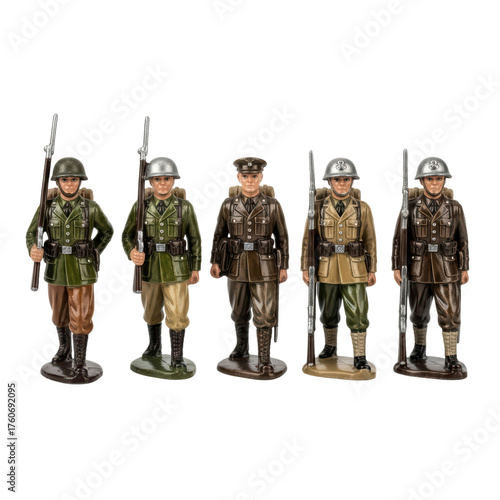 Group of antique military figurines with helmets and rifles on black background