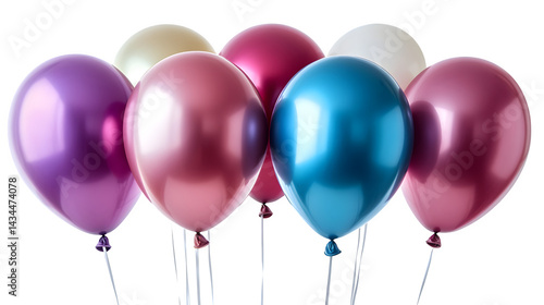 Group of birthday balloons in vibrant colors floating together isolated on white background