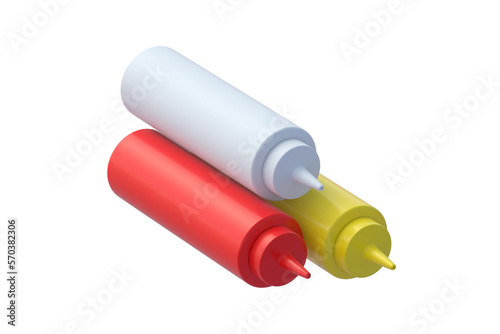 Group of bottles for sauces for fast food isolated on white background. 3d render