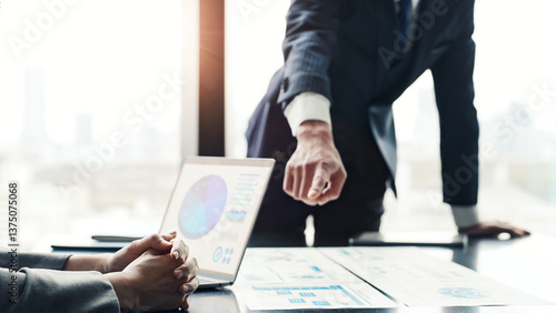 Group of business people meeting in an office with city in the background