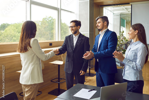 Group of business people meeting in office, making agreements and exchanging handshakes. Happy man and woman shake hands while colleagues applaud. Professional cooperation and teamwork concept