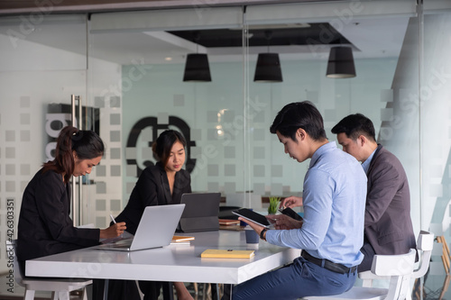 Group of Businessman and Accountant checking data document on digital tablet for investigation of corruption account . Anti Bribery concept