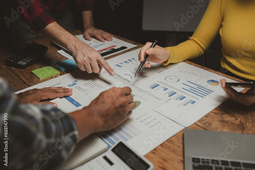 Group of businessmen working together to calculate income, They are revising the financial numbers, Take out financial documents and check them with a calculator, financial idea.