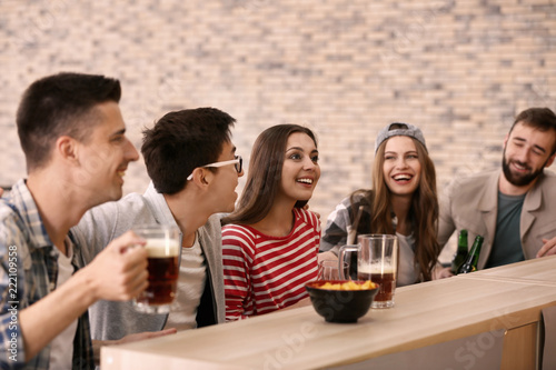 Group of cheerful friends drinking beer in bar