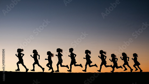 Group of children energetically running into the sunset evening.